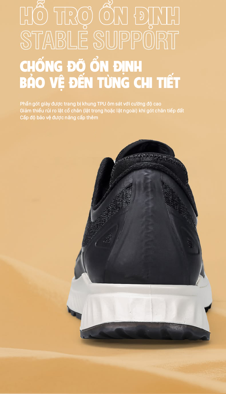 STABLE SUPPORT: Hỗ trợ ổn định. Chống đỡ ổn định. Bảo vệ đến từng chi tiết. Phần gót giày được trang bị khung TPU ôm sát với cường độ cao Giảm thiểu rủi ro lật cổ chân (lật trong hoặc lật ngoài) khi gót chân tiếp đất Cấp độ bảo vệ được nâng cấp thêm.