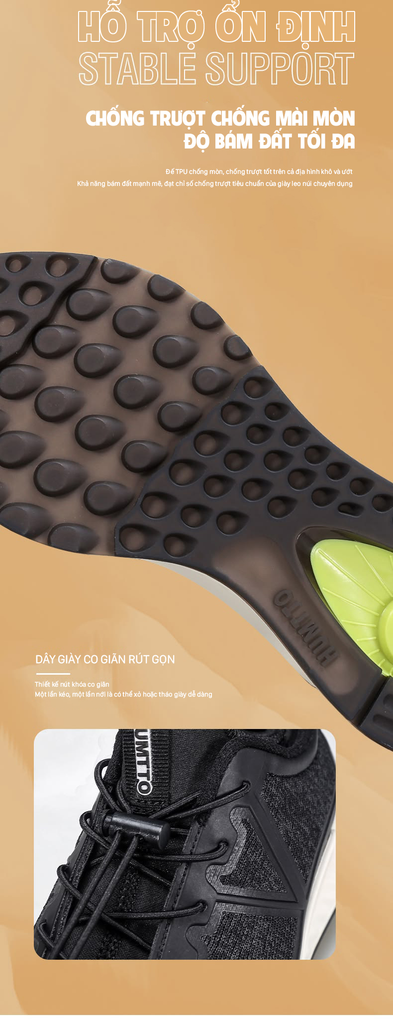 STABLE SUPPORT: Hỗ trợ ổn định | Chống trượt chống mòn | Độ bám đất tối đa. Đế TPU chống mòn, chống trượt tốt trên cả địa hình khô và ướt Khả năng bám đất mạnh mẽ, đạt chỉ số chống trượt tiêu chuẩn của giày leo núi chuyên dụng. DÂY GIÀY CO GIÃN RÚT GỌN. Thiết kế nút khóa co giãn Một lần kéo, một lần nới là có thể xỏ hoặc tháo giày dễ dàng.