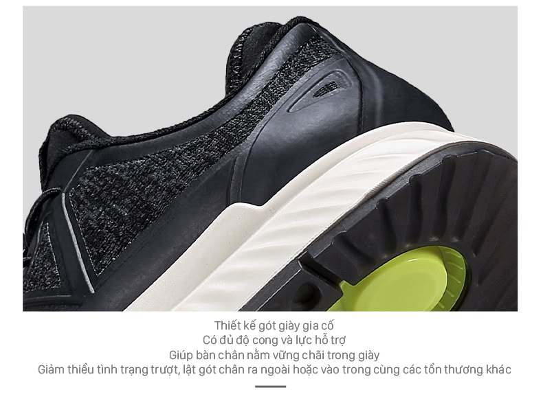 Thiết kế gót giày gia cố Có đủ độ cong và lực hỗ trợ Giúp bàn chân nằm vững chãi trong giày Giảm thiểu tình trạng trượt, lật gót chân ra ngoài hoặc vào trong cùng các tổn thương khác.