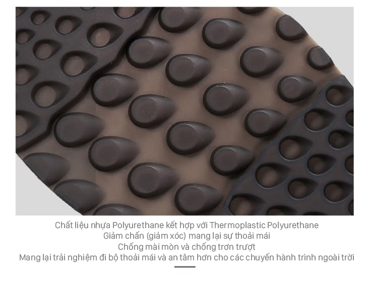Chất liệu nhựa Polyurethane kết hợp với Thermoplastic Polyurethane Giảm chấn (giảm xóc) mang lại sự thoải mái Chống mài mòn và chống trơn trượt Mang lại trải nghiệm đi bộ thoải mái và an tâm hơn cho các chuyến hành trình ngoài trời.