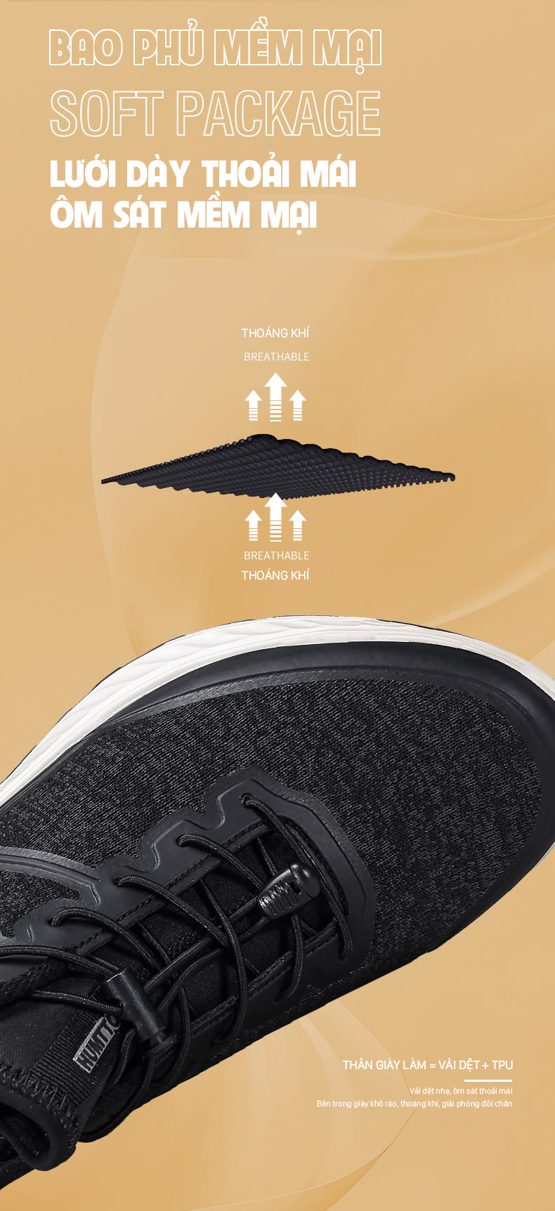 SOFT PACKAGE: Bao phủ mềm mại. Lưới dày thoải mái. Ôm sát mềm mại. THÂN GIÀY LÀM = VẢI DỆT + TPU. Vải dệt nhẹ, ôm sát thoải mái Bên trong giày khô ráo, thoáng khí, giải phóng đôi chân.