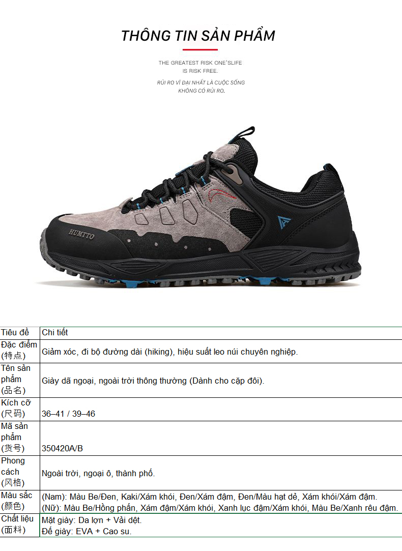 Size đa dạng từ 36-41 cho nữ và 39-46 cho nam, kèm chế độ bảo hành 1 năm. Giày hiking pro couple Humtto 350420AB cổ thấp da heo chống sốc va đập là lựa chọn hoàn hảo giúp bạn tự tin băng qua núi non, cánh đồng và chinh phục mọi thử thách ngoài trời một cách an toàn, thoải mái.