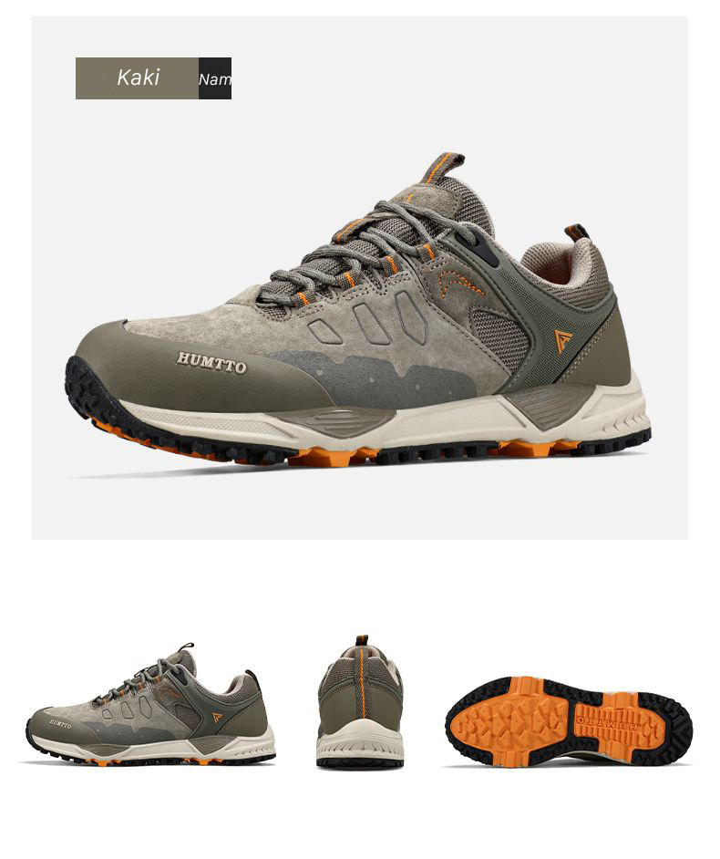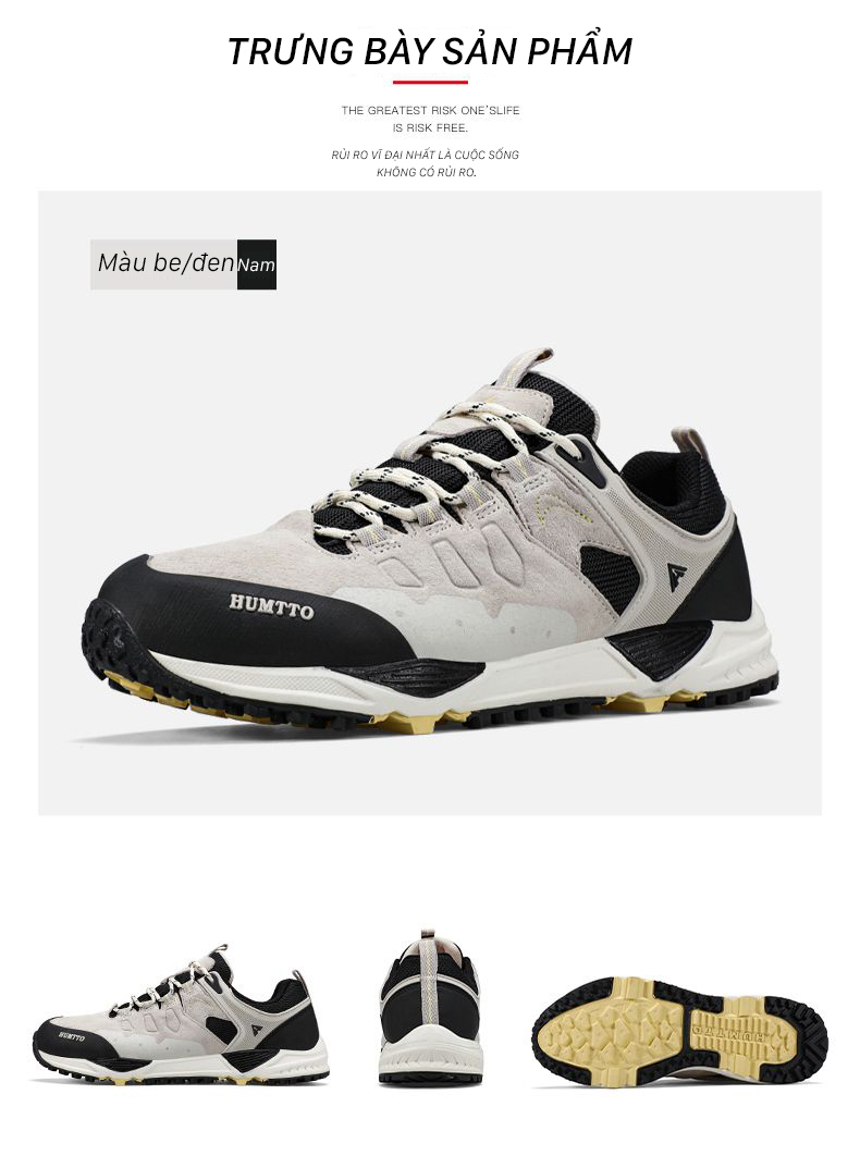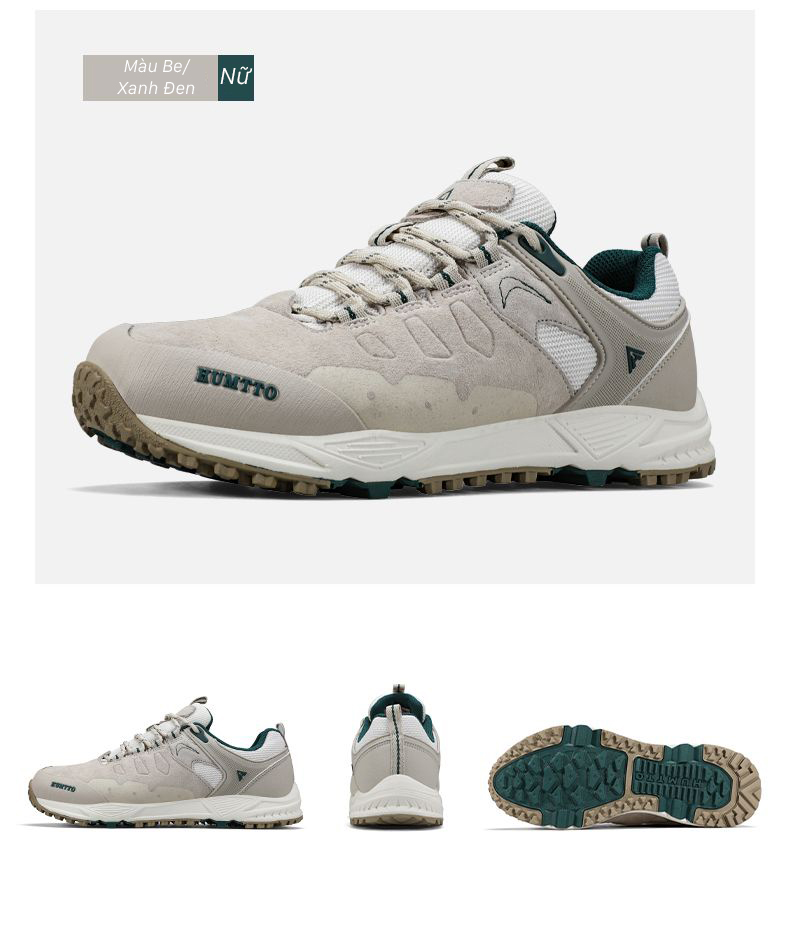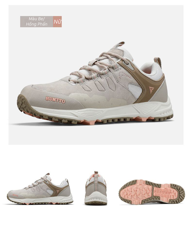 Phần thân giày ghép nối có kết cấu tăng cường độ ôm và sự ổn định cho bàn chân, cung cấp cảm giác thoải mái một cách hiệu quả trong suốt hành trình dài. Lớp lót Polyester mềm mại, thoáng khí giúp đôi chân luôn khô ráo. Đế ngoài cao su EVA với hoa văn hạt nổi chống trượt chuyên dụng mang đến khả năng bám đất vượt trội, chống mài mòn và thích ứng hoàn hảo với nhiều loại địa hình từ núi đá, rừng rậm đến đường phố thành thị. Giày hiking pro couple Humtto 350420AB cổ thấp da heo chống sốc va đập có đa dạng màu sắc phong phú: nam có Be/Đen, Kaki/Xám khói, Đen/Xám đậm, Đen/Hạt dẻ, Xám khói/Xám đậm; nữ có Be/Hồng phấn, Xám đậm/Xám khói, Xanh lục đậm/Xám khói, Be/Xanh rêu đậm.