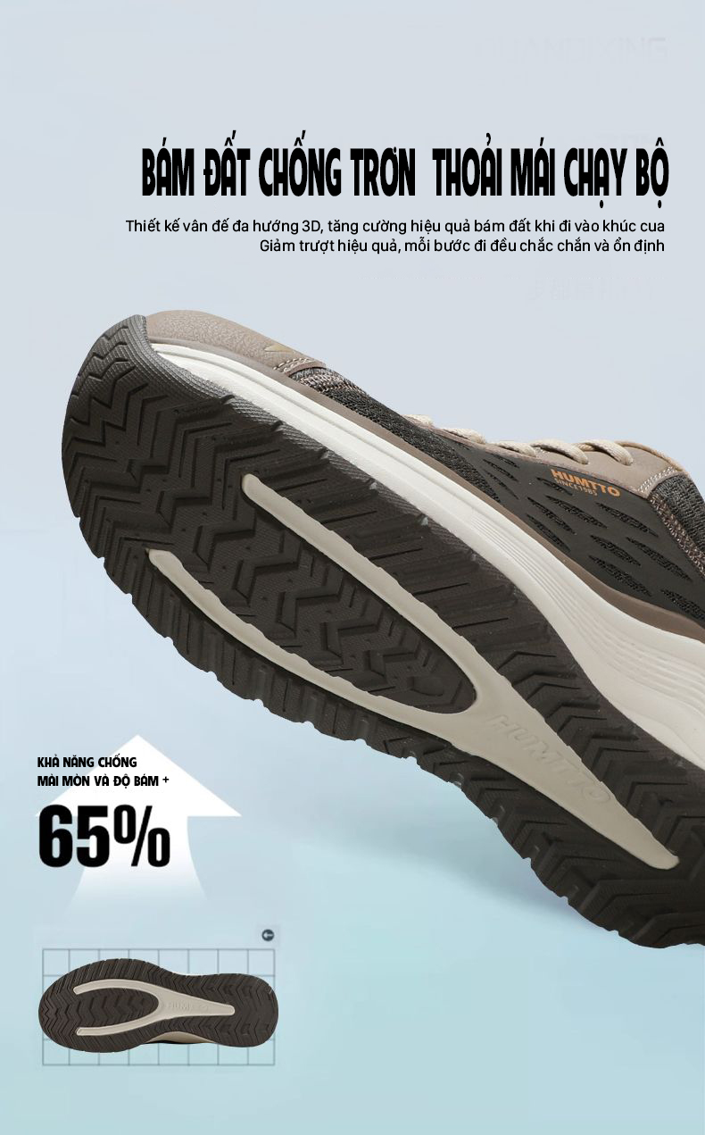 Bám đất chống trơn – Thoải mái chạy bộ. Thiết kế vân đế đa hướng 3D, tăng cường hiệu quả bám đất khi đi vào khúc cua. Giảm trượt hiệu quả, mỗi bước đi đều chắc chắn và ổn định. Khả năng chống mài mòn và độ bám tăng thêm 65%.